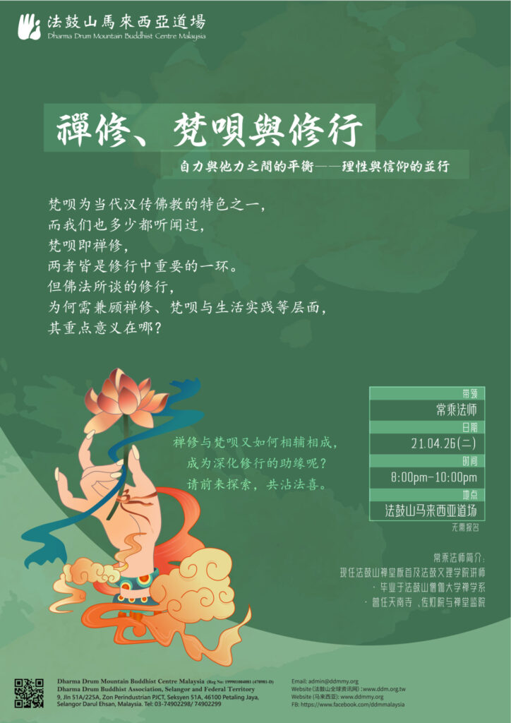 2026【禪修、梵唄與修行】講座 简章带领:常乘法师日期 :21/04/2026 (二) 时间 :8:00pm – 10:00pm地点:法鼓山马来西亚道场无需报名,敬请尽早入座。 Uncategorized, 其他, 法鼓活動, 熱門活動, 禪修