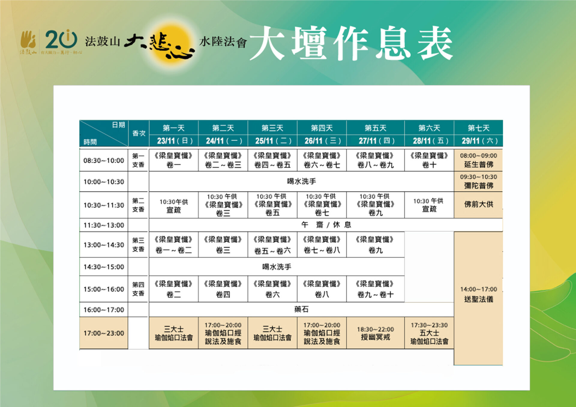 在探讨传统丧仪的环节中,法师鼓励义工重新省思丧仪背后的真正意涵。多数人也逐渐体会到,丧仪的存在,并非为了形式与排场,而是为了让家属有时间与空间逐步接受亲人离世的事实,并借此献上最后的道别与祝福。法师进一步说明,圣严师父所倡导的礼仪环保,主张佛化奠仪应简约庄严,去除繁文缛节,既不铺张浪费,也不失庄重敬意。透过参与大事关怀的五个阶段(临终关怀、助念、慰问、追思祝福与后续关怀),义工们不仅陪伴家属走过悲伤,也能引导他们接触正信佛法,进而踏上学佛修行之路,同时为往生者累积无量福德。