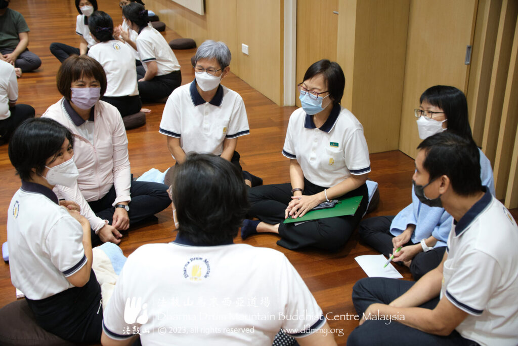 二位資深的劝募义工——叶文珊与黄淑铃也与学员们分享自身的劝募经历与成长。亦是课程组组长的文珊抱着“募人来学佛” 的心态来规划与筹办道场内的课程,不论参与者的多寡,只要有人愿意来学佛,课程仍会办下去。她坦露劝募与弘法的使命无形中推动她认真完成自己在职场上被赋予的任务,也照顾身心的健康,让她有更大的能力去做布施。性格内向的淑铃也表示,承担劝募会员后,自己的善意也影响了公司的其他同事一起做布施与学佛,而自己在学佛路上持续的修行也让她变得谦卑,並且愿意为了大众的利益,而突破自己的舒适圈,与学员们分享所学。