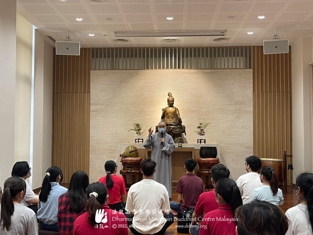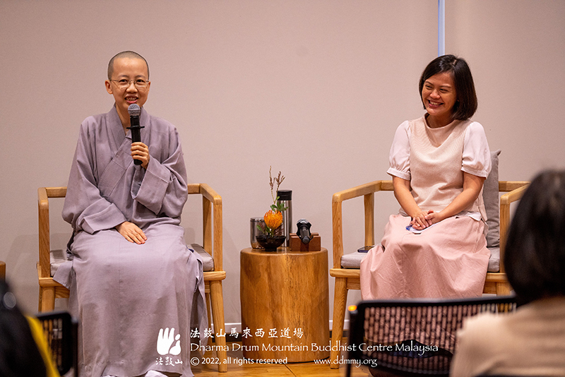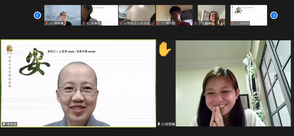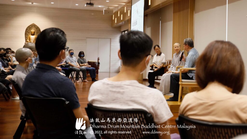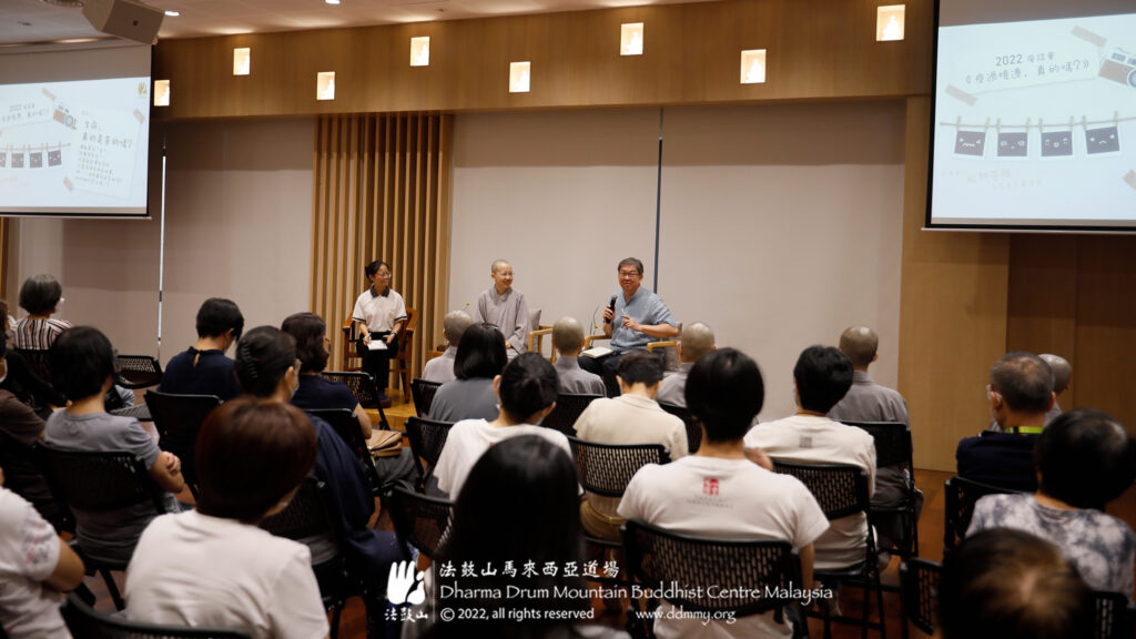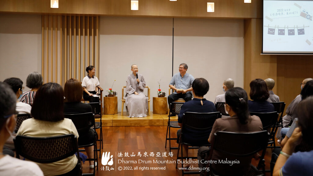 接着「如何用佛法解决困难或逆境?」环节中,法师先是以开放提问的方式切入,分享如何在筹办活动时,利用佛法的智慧自利利他,减除心理上不必要的压力和负担。圣严师父的影片中提到:「情绪的反应从观念产生,并不是与生俱来或一成不变的。若观念改变,苦的事实便不存在。」虽然观念上清楚知道,但却还是会因为外境而产生一些情绪。法师也藉此因缘分享「四它」的观念,鼓励大家遇到挫折的时候,学习心平气和地面对、接受、处理和放下,因为任何事本来都在无常变化中。法师提到可以藉念佛、诵经、唱诵和打坐等方法,让心有安置处,又或是为自己设下定课,会帮助自己比较容易觉察心念的起伏。