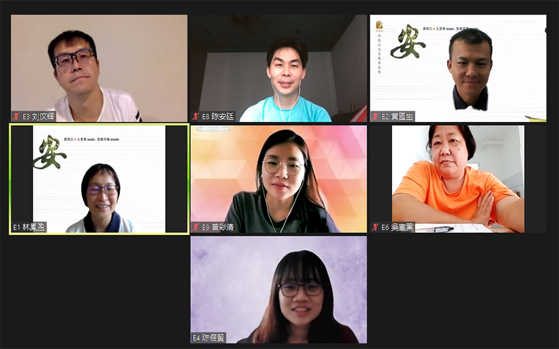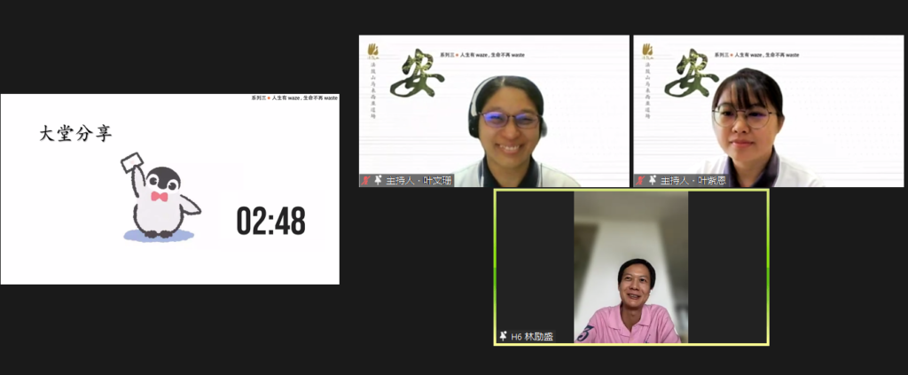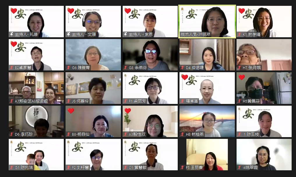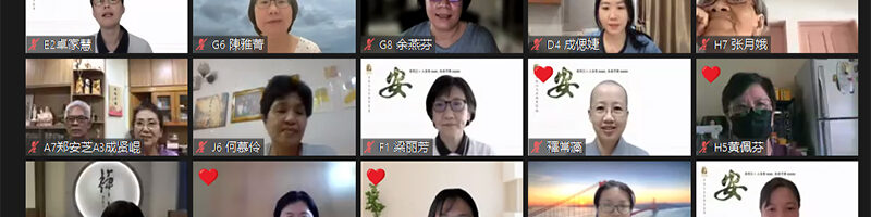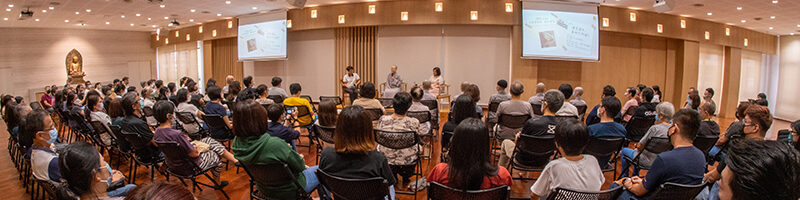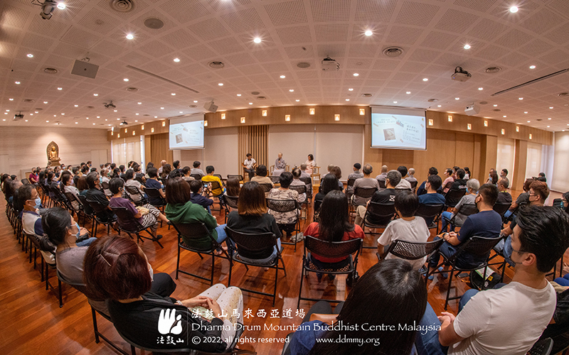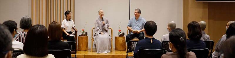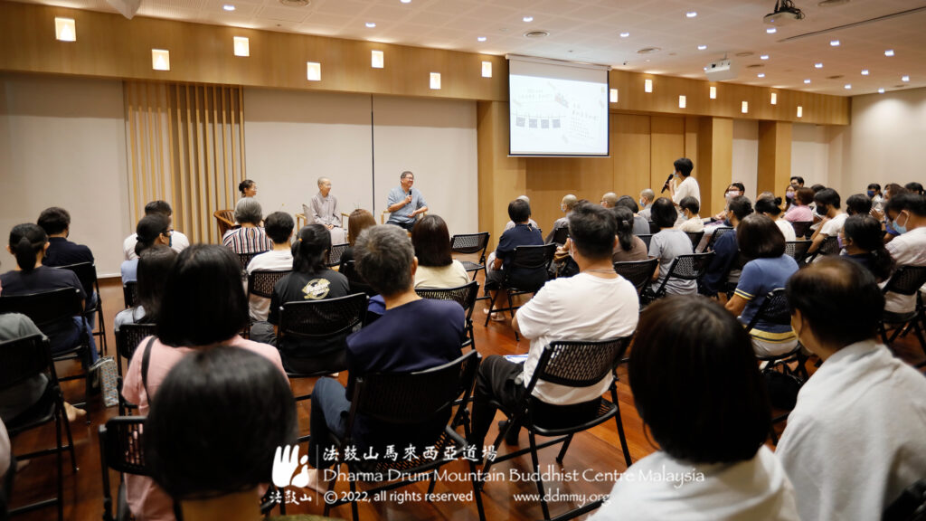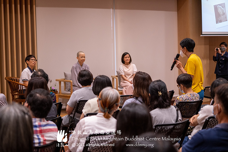 接着「如何用佛法解决困难或逆境?」环节中,法师先是以开放提问的方式切入,分享如何在筹办活动时,利用佛法的智慧自利利他,减除心理上不必要的压力和负担。圣严师父的影片中提到:「情绪的反应从观念产生,并不是与生俱来或一成不变的。若观念改变,苦的事实便不存在。」虽然观念上清楚知道,但却还是会因为外境而产生一些情绪。法师也藉此因缘分享「四它」的观念,鼓励大家遇到挫折的时候,学习心平气和地面对、接受、处理和放下,因为任何事本来都在无常变化中。法师提到可以藉念佛、诵经、唱诵和打坐等方法,让心有安置处,又或是为自己设下定课,会帮助自己比较容易觉察心念的起伏。