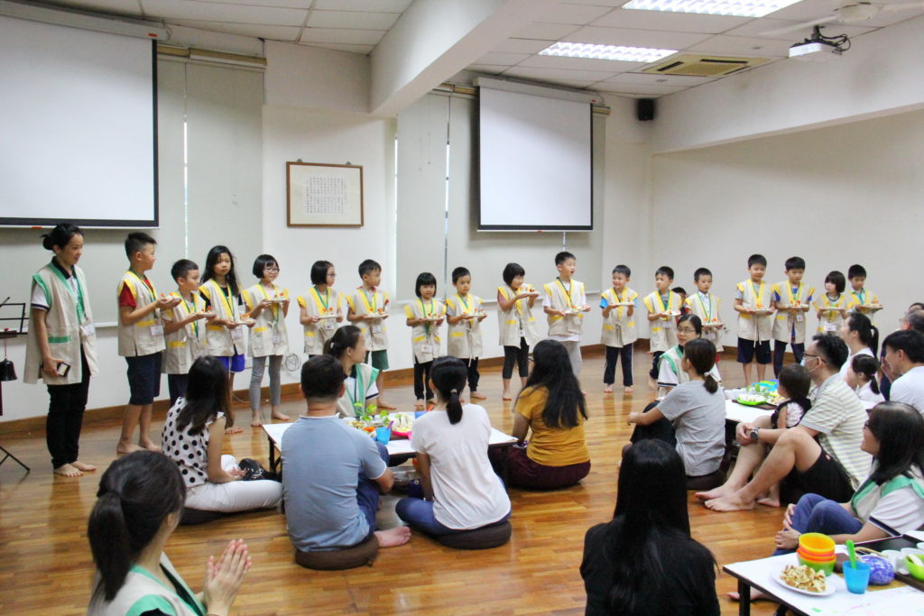 孩子的成长过程中,父母的陪伴是不可或缺的。悲心班儿童生命教育课程除了专属家长的“父母成长工作坊”之外,也在每一堂孩子的课程中涵盖了亲子时光。小小供养人“心灵茶点”不但能促进亲子关系,同时也培养孩子们奉献与培福的心态,更藉着食物的供养学习惜福和感恩。每一堂课的“回家游戏”也邀请了父母的参与,乃至家庭总动员一起完成呢!