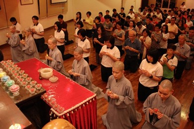 紧接『夹豆禅』之后的是通过弹唱佛曲介绍『微笑禅』。这次的弹唱环节由法青嘉俊菩萨和淋荔菩萨领唱。通过清耳悦心的佛曲放松身心,并试着以微笑的方式来放松脸部,体验自己的脸颊由僵硬慢慢的放松而嘴角逐渐微微上扬。简单的一个微笑,除了让自己放松,更可以通过『布施微笑』的方法散播正能量,让自己以及身边的人一起感受幸福快乐。
