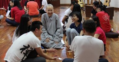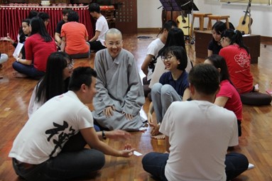 接下来是由演祥法师和佛学会师生分享法鼓山的宝:禅修。法师通过生活化的例子,传达一个明确的概念:禅修不一定是躲在深山老林中的枯坐,也可以在每天生活里的行住坐卧中体验。为了更好的体验『生活无处不禅修』,法师带领佛学会的师生进行一场『夹豆禅』的小游戏,让他们体验在紧绷的情绪和放松清楚的身心夹红豆的差别。