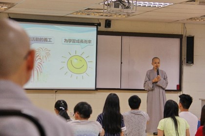法师一开始先来引导学员们探讨,为何来当义工这一个课题。法师分享到,我们来当义工,都是有着同一个身分(佛学会的义工),然后共同来做同样的一件事情。法师也分享到,佛法可以很生活化,可以让我们成长,让我们更认识自己,然后成为一位更好的人。佛法教我们在办活动的过程中,如何照顾好自己的心,也如何照顾好别人的心。