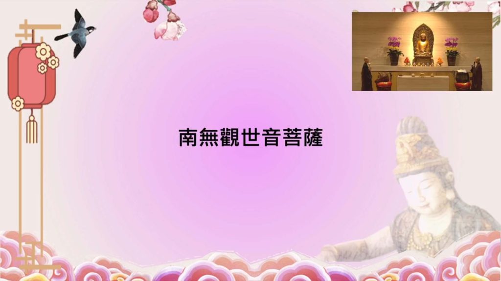 法会开始前,演莲法师慈悲开示:虽然我们没能集合在同一个场地,可是随着大众的心愿与方向是一致的,心的力量就有共鸣。彼此能够感受到心是互相支援、互相祝福的,这就是心的愿力,因缘就会随着改变。虽然肉眼看不到这股心的力量,信众们感念观世音菩萨的慈悲愿力,虔诚地诵念菩萨圣号以及持诵《大悲咒》与《心经》,必定能摄心、安心的。法师劝勉大众在法会圆满之后,若能够在平日持续用功修行的话,祝福的力量将会依然持续。对佛法生起信心,学习修持观音法门的四个层次:念观音、求观音、学观音、做观音。发愿学习观音菩萨救苦救难的菩萨精神,我们的观念与行为会慢慢改变,这是生命的态度、方向与动力。人人就能体会到身边都有观音菩萨,同时发愿自己也要成为别人的观音菩萨,发愿成为人间的菩萨,所谓:慈悲没有敌人,智慧不起烦恼。